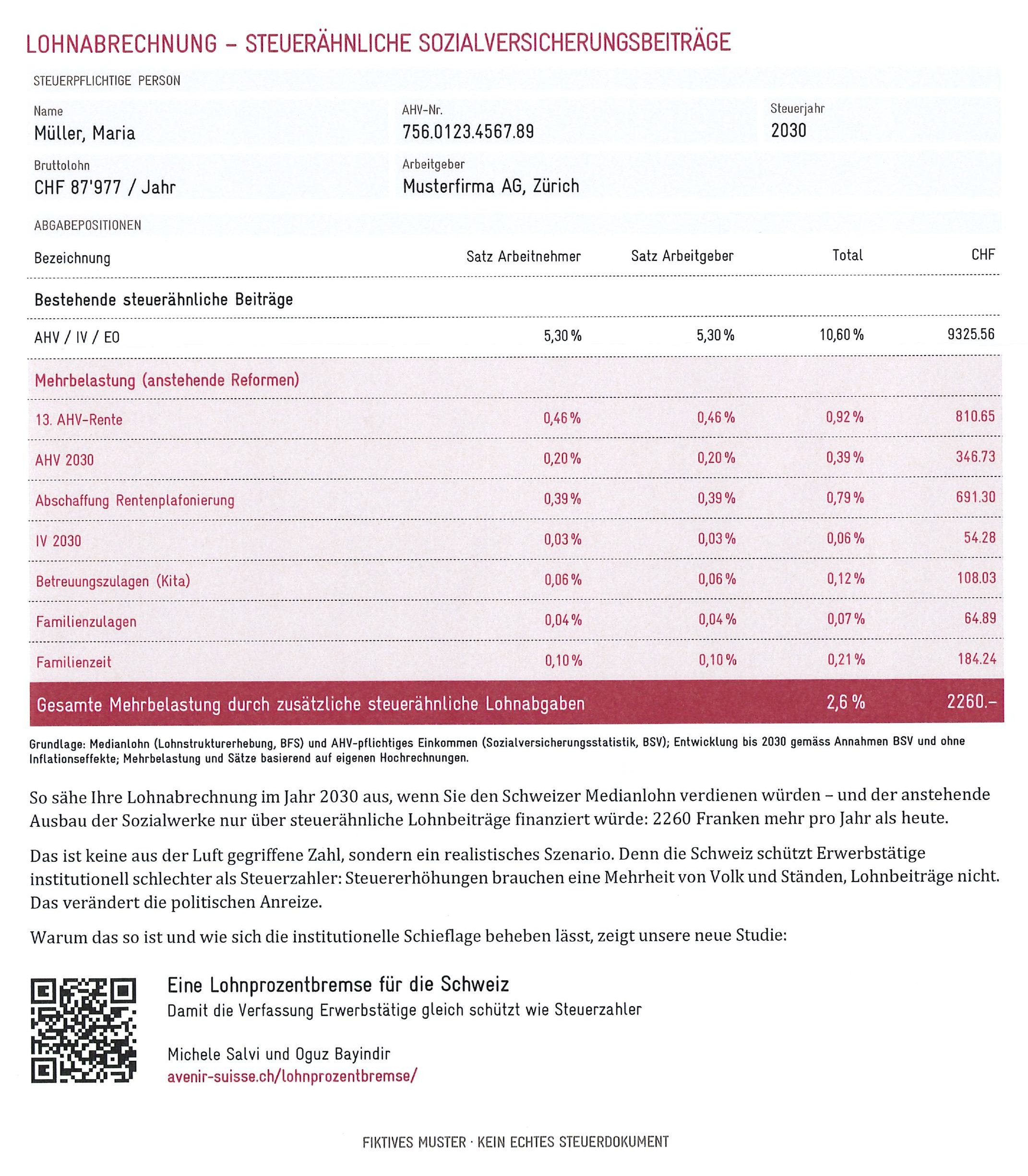 Die Bundesverfassung begrenzt zwar die Höhe der Steuern, nicht aber der Lohnabgaben. Obschon AHV-, IV- und EO-Beiträge faktisch wie Steuern wirken, können sie aber mit tieferen politischen Hürden erhöht werden. Dadurch entstehe in der Politik ein Fehlanreiz: Neue Sozialleistungen werden bevorzugt über die Lohnabrechnung finanziert – nicht aus sachlichen Gründen, sondern aus taktischen Überlegungen. Avenir Suisse schlägt deshalb eine «Lohnprozentbremse» vor: einen verfassungsrechtlichen Maximalsatz für steuerähnliche Lohnbeiträge, analog zu den bestehenden Höchstsätzen für Steuern.